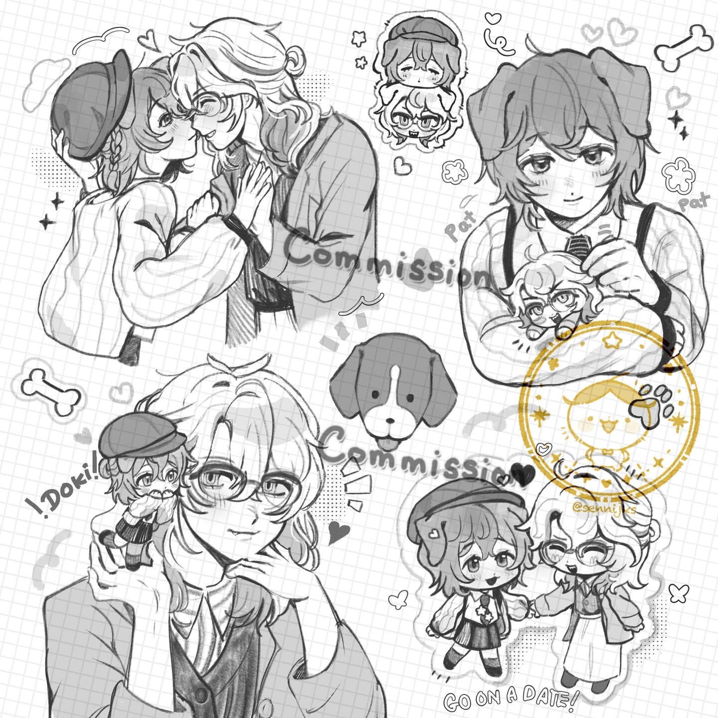 | Solo (1 character) will have 5-6 sketches, couple (2 characters) has 4 sketches in one sheet. |